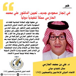 في خطوة تؤكد المكانة المتنامية للكفاءات السعودية عالمياً أعلن الاتحاد الدولي للإعلاميين والصحفيين تعيين الدكتور علي محمد الحازمي ممثلاً تنفيذياً دولياً للاتحاد ليكون أول سعودي يتقلد هذا المنصب الرفيع